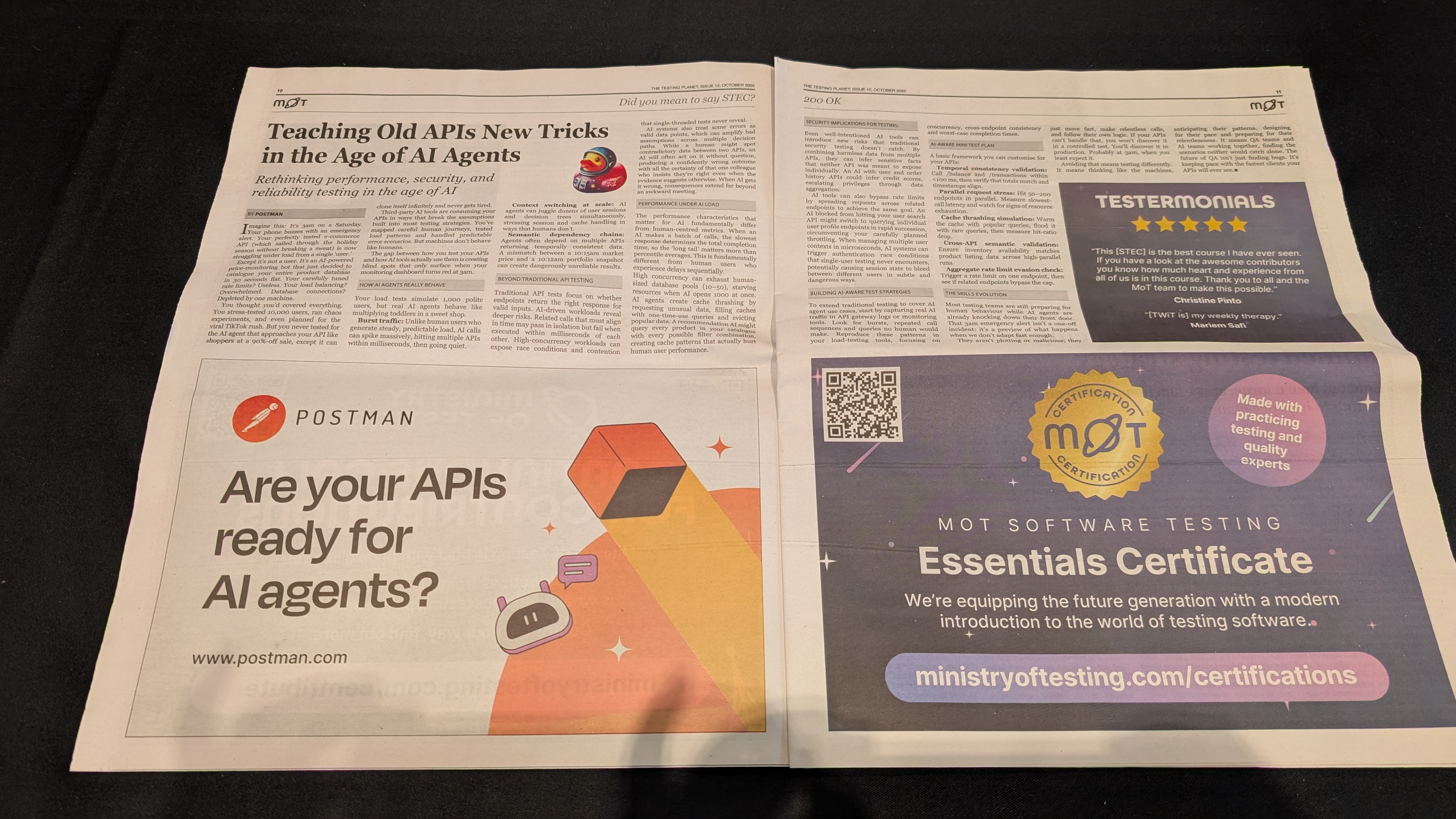 Published in Ministry of Testing newspaper for TestBash Brighton 2025. Article explores rethinking performance, security, and reliability testing in the age of AI agents.